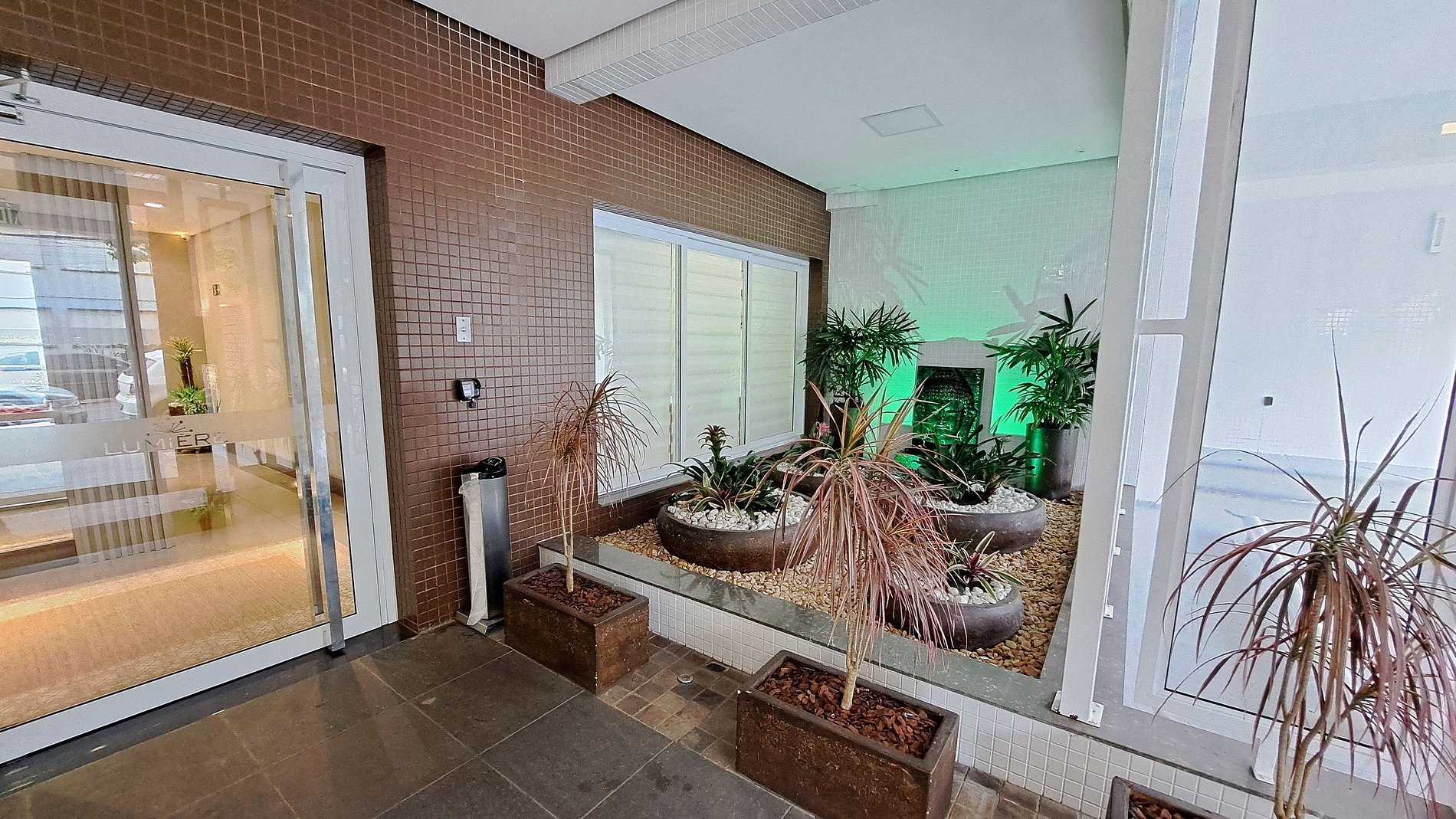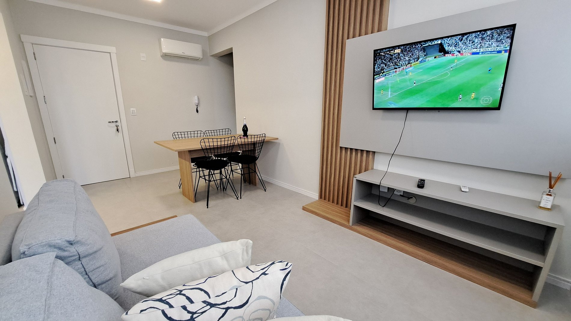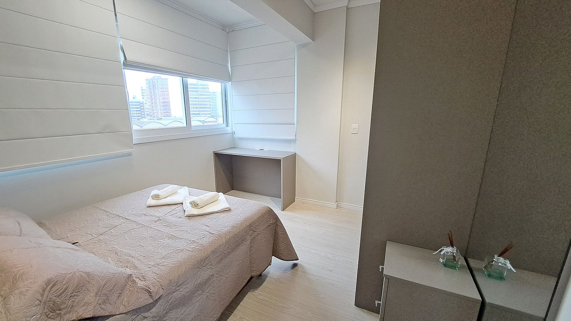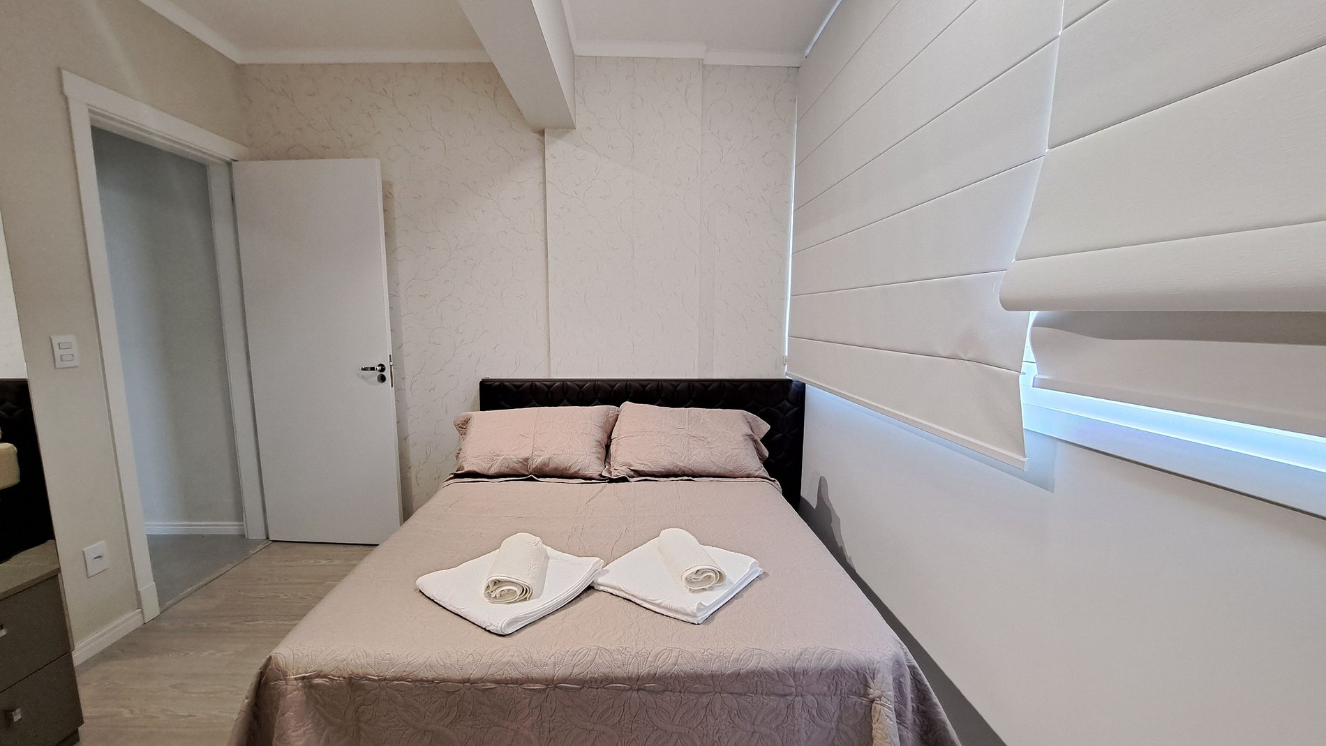 Apartamento de um quarto com cama de casal, roupas de cama, cobertores, cortina blackout, closet e mesa para trabalho. Sala de jantar e estar conjugadas, com mesa para quatro pessoas, ar-condicionado, TV smart, sofá, cortina blackout, wifi e vista para a vinícola Aurora. Cozinha equipada com louças, taças, talheres, panelas, micro-ondas, forno, fogão, geladeira, cafeteira, sanduicheira, bancada de granito, máquina de lavar roupa, varal e aquecimento de água a gás. Vaga de garagem coberta e fechada para um carro grande, como uma caminhonete. Prédio novo com dois elevadores.