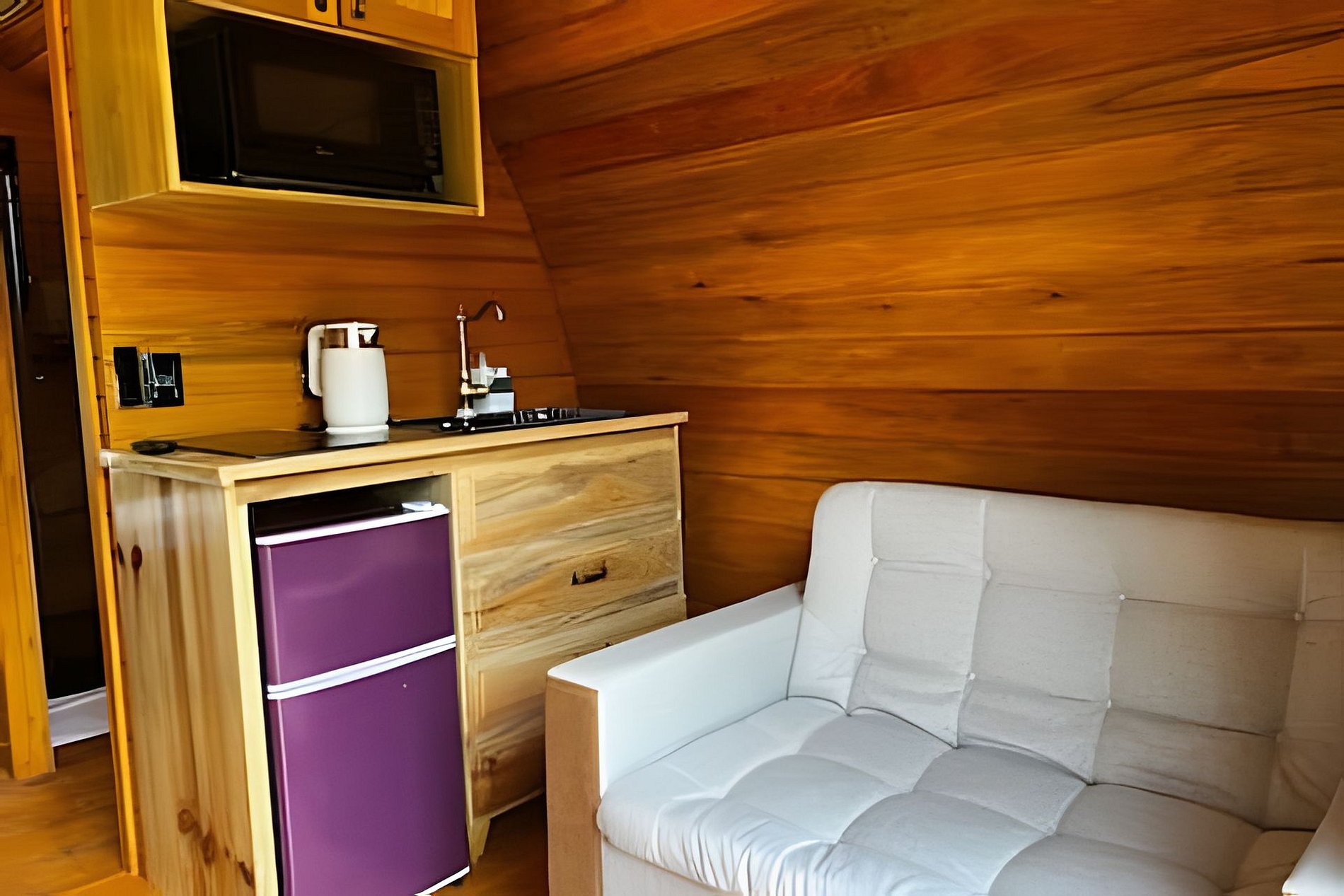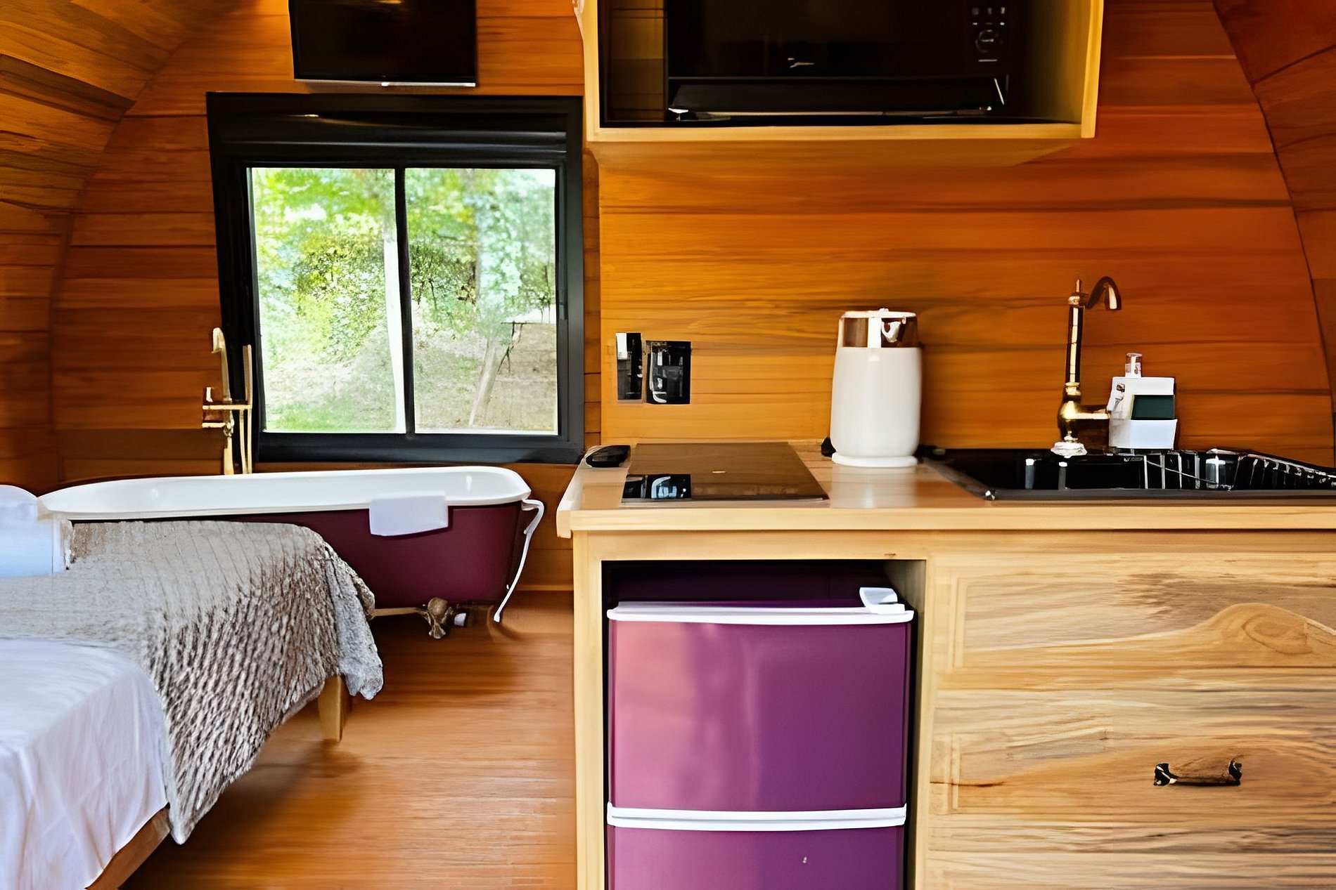Ao entrar na cabana, você é recebido por um ambiente acolhedor e cuidadosamente planejado, onde o charme da madeira se combina com o conforto moderno. O espaço é integrado e funcional, com uma atmosfera intimista que convida ao descanso. Cama de casal confortável, iluminação aconchegante. A cabana conta com ar condicionado quente/frio, banheira de imersão com hidromassagem, cozinha compacta com fogão, micro-ondas, fogão, chaleira elétrica, sanduicheira, louças, taças e demais utensílios para sua comodidade. O banheiro é moderno com ducha de água quente e ótima pressão, dando conforte e relaxamento. Para completar a experiência a área interna se conecta com a área externa, através da varanda privativa, permitindo que você aproveite a vista dos vinhedos e do jardim "Entre Pipas e Vinhedos".