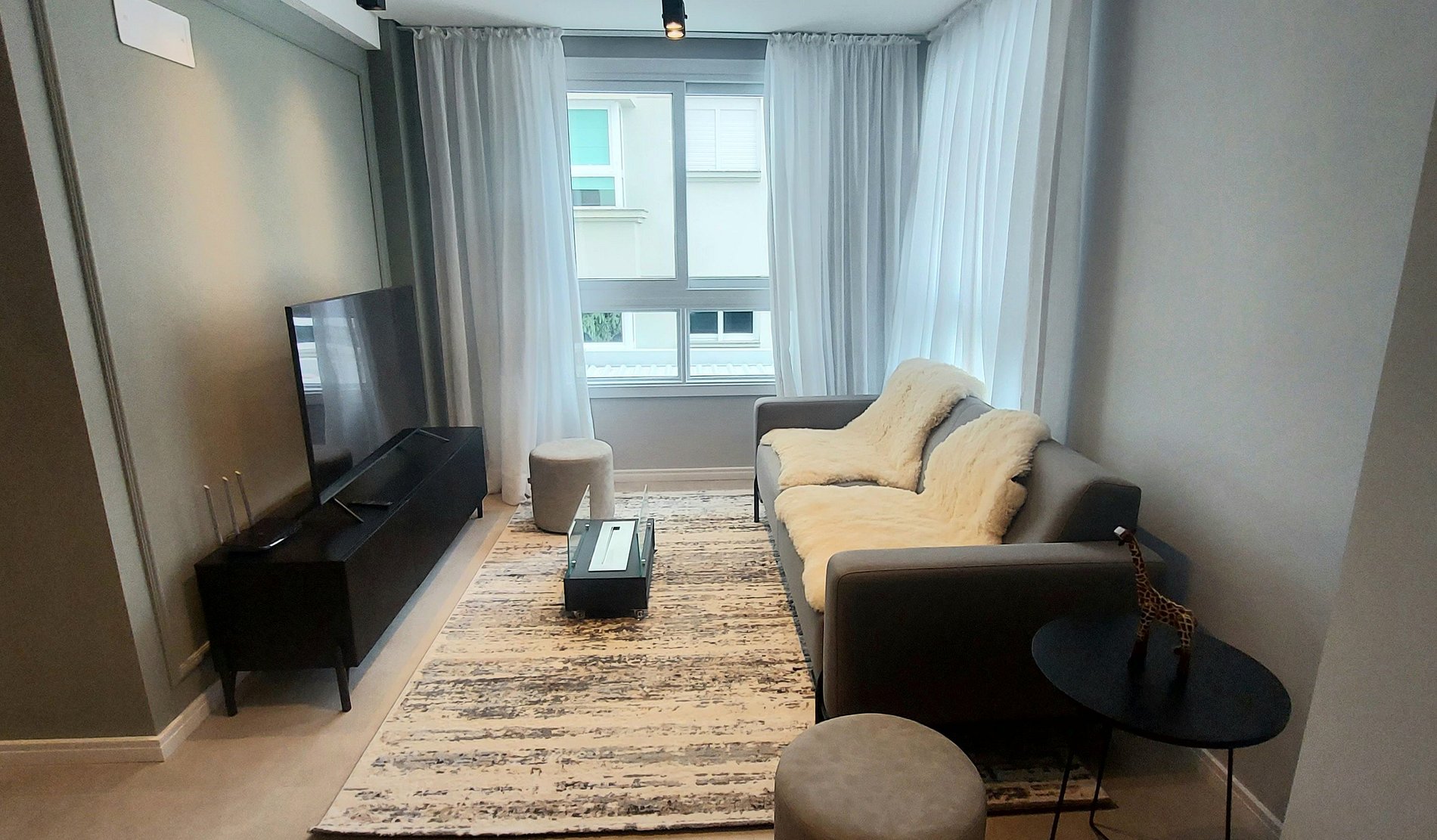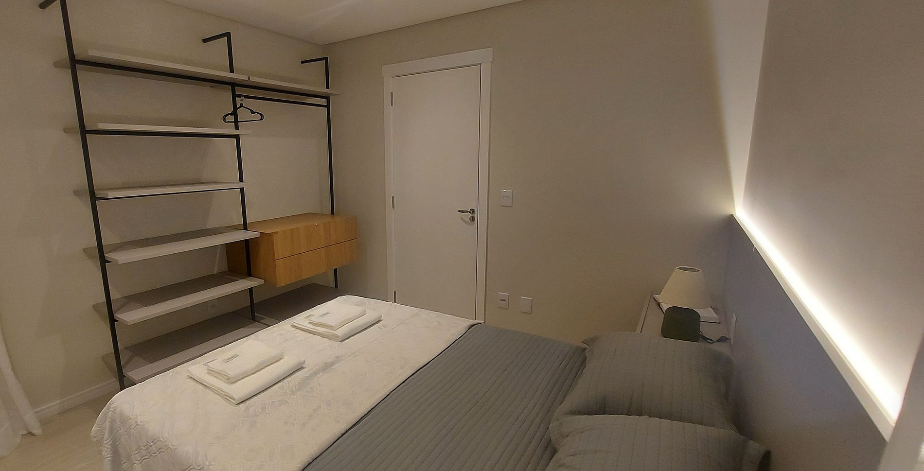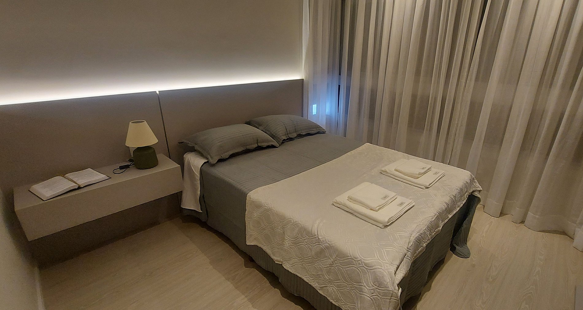 Apartamento com dois dormitórios, sendo ambos com cama de casal padrão, roupeiros estilo closet, roupas de cama e banho de excelente qualidade, ar condicionado quente/rio, banheiro com chuveiro grande aquecido por junker, cozinha completa com eletrodomésticos e utensílios para quatro pessoas, mesa de jantar, sala de estar com lareira ecológica, ar condicionado quente/frio, TV smart, lavanderia com maquina de lavar, área externa na cobertura para uso em comum, estacionamento coberto e fechado no próprio condomínio.