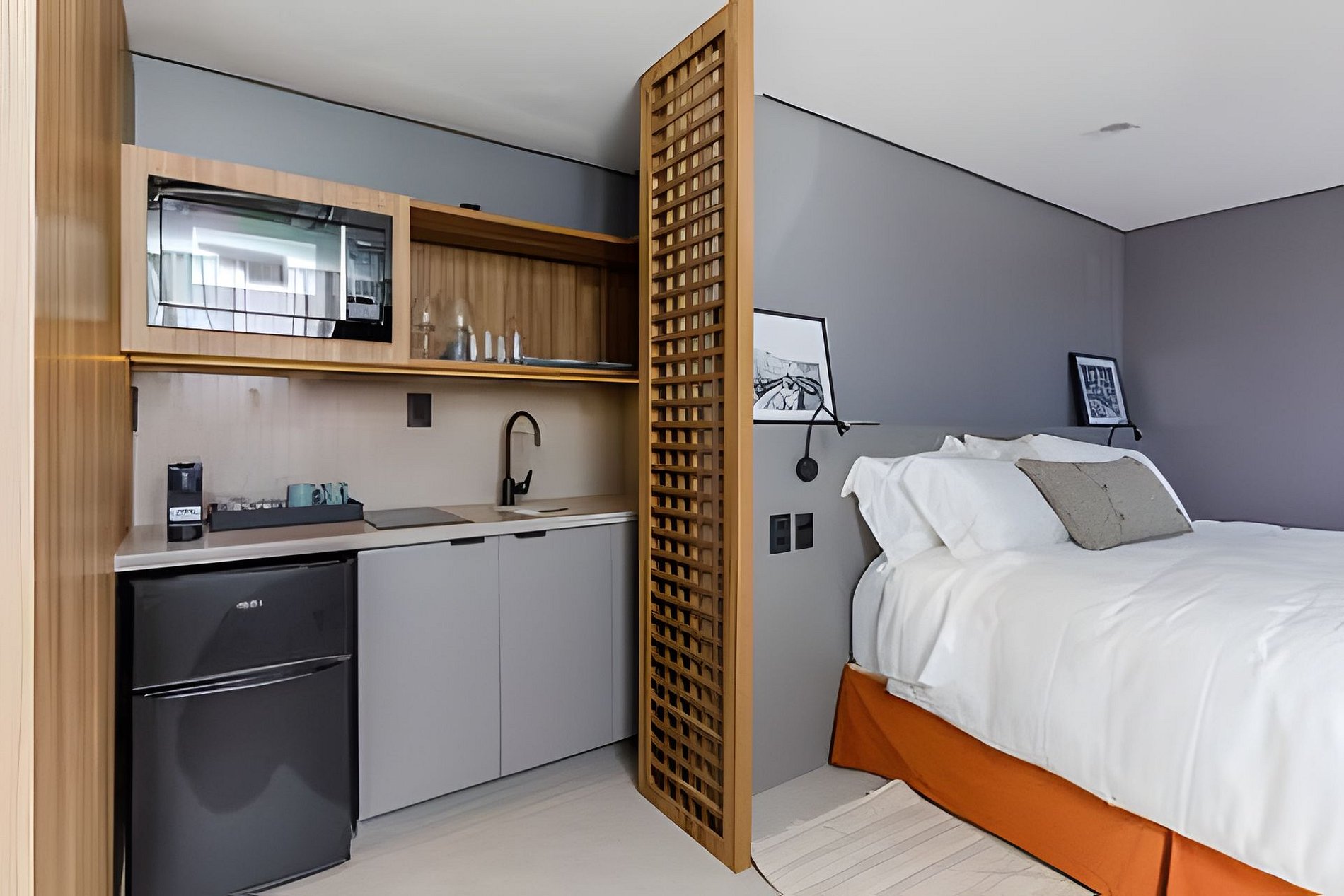 A copa é totalmente equipada para sua comodidade: Cooktop Micro-ondas de embutir Frigobar Grill Chaleira elétrica Cafeteira Nespresso Louçaria de alto padrão