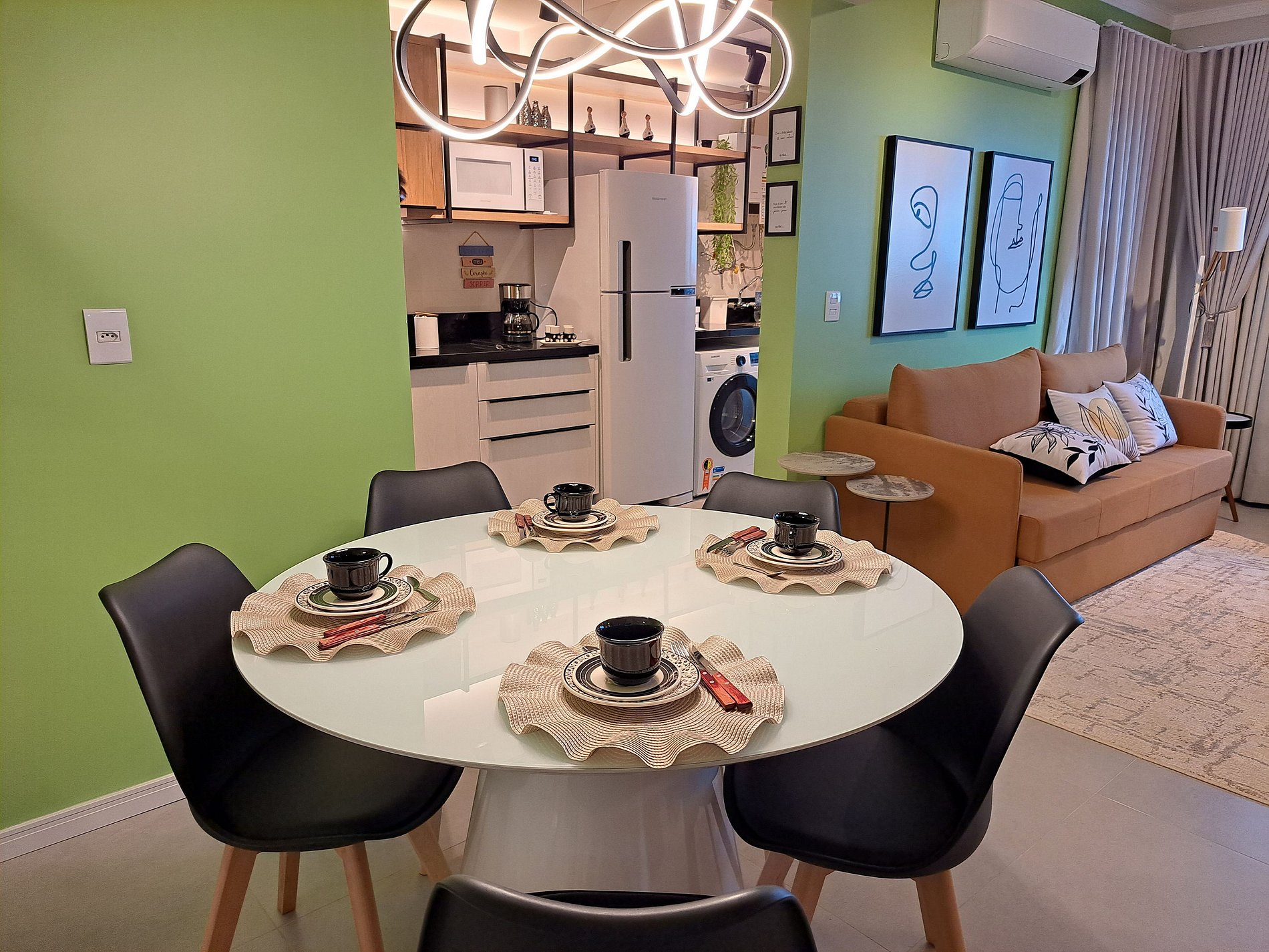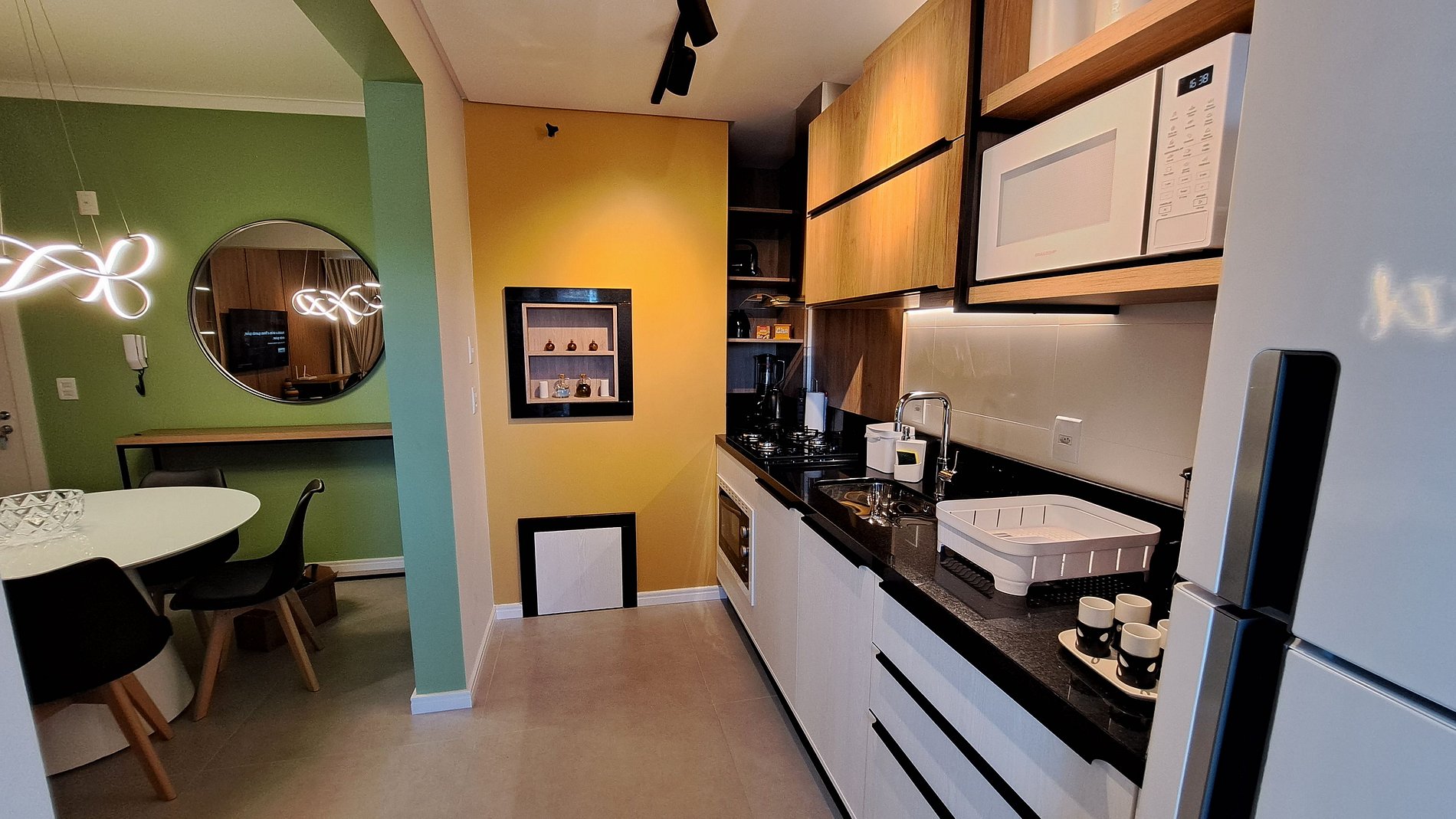 O imóvel possui dois dormitórios, sendo um deles uma suíte. No primeiro dormitório, há uma cama de casal queen, armário com cabide para roupas, roupas de cama e banho, cobertores, travesseiros antialérgicos, ar-condicionado quente e frio, iluminação moderna e aconchegante, espelho e blackout nas janelas. O banheiro da suíte oferece água quente aquecida a gás. O segundo dormitório conta com cama de casal padrão, armário com cabide, roupas de cama e banho, cobertores, travesseiros antialérgicos, climatizador quente e frio, iluminação acolhedora, blackout nas janelas e espelho. O banheiro social também possui água quente aquecida a gás. Na sala de estar, você encontra um sofá-cama de casal, tv smart de 48 polegadas, poltronas, cortinas blackout, adega climatizada para vinhos, cristaleira com variedade de taças, iluminação aconchegante, ar-condicionado quente e frio e uma linda vista para a cidade e o vale. A sala de jantar é integrada à sala de estar e conta com mesa para 6 pessoas. A cozinha é moderna e completa, equipada com forno, fogão, coifa, churrasqueira, cafeteira, torradeira, micro-ondas, jarra elétrica e todos os utensílios domésticos necessários. A lavanderia possui máquina de lavar e secar roupas, além de varal. O prédio dispõe de dois elevadores, garagem fechada e coberta para um carro dentro do condomínio e área externa com jardim.